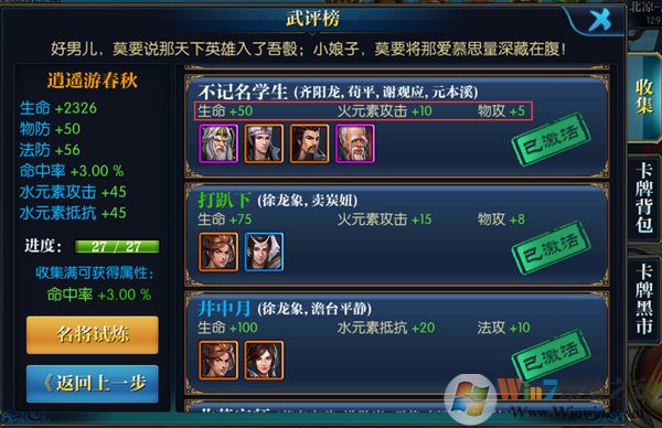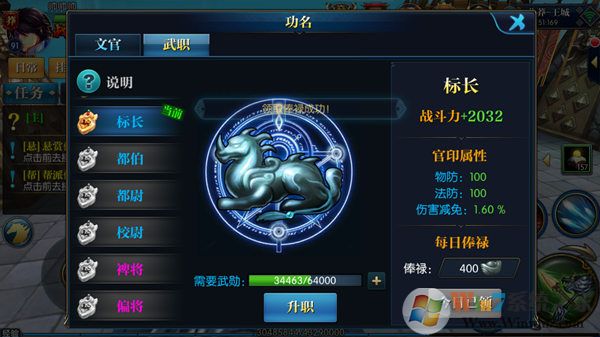 功名系統(tǒng),功名分文官和武職兩種,官位越高,戰(zhàn)斗力加成越高。文官升級(jí)需要名望,名望的獲取,玩家需要進(jìn)行每日答題活動(dòng),答對(duì)的題目越多,獲得的名望越多,名望達(dá)到升級(jí)要求就可以進(jìn)行升級(jí)了。武職的升級(jí)需要武勛,武勛可以通過每日競(jìng)技場(chǎng)或者擊殺敵國(guó)玩家獲取,同樣,武勛達(dá)到升級(jí)要求便可進(jìn)行升級(jí),官職系統(tǒng)每日還會(huì)提供將軍俸祿。