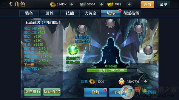 境界系統(tǒng),境界需要玩家有足夠的感悟值,感悟值用來修煉獲得修為,修為滿了之后會(huì)提升一個(gè)小境界,小境界達(dá)到10級(jí)需要破障丹進(jìn)行突破,突破之后可以繼續(xù)修煉,每一個(gè)大境界有低級(jí),中階,高階,巔峰,圓滿5個(gè)小境界,每突破一次,都會(huì)為玩家?guī)泶罅繉傩院蛻?zhàn)斗力的加成。