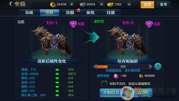 坐騎系統(tǒng),坐騎可以進(jìn)行升階,升階需要消耗一定數(shù)量的坐騎進(jìn)階丹,商城有出售,在進(jìn)階的時(shí)候,玩家可以選擇自動(dòng)購(gòu)買坐騎進(jìn)階丹,坐騎進(jìn)階不但為玩家提供屬性加成,還會(huì)解鎖新的形象,坐騎階數(shù)越高。洗髓時(shí)可以洗髓的百分比也越高,洗髓直接為玩家增加屬性,小編非常喜歡這一項(xiàng)。坐騎還有不同的血統(tǒng)可供玩家選擇,不同的血統(tǒng)成長(zhǎng)加成也不同,適合不同的職業(yè),玩家可以選擇最適合自己職業(yè)的血統(tǒng)來進(jìn)行培養(yǎng)。血統(tǒng)品階越高,坐騎的基礎(chǔ)屬性,成長(zhǎng)率和轉(zhuǎn)換率也會(huì)越高,特別推薦。還有坐騎技能,技能有直接為加成和加成到坐騎兩種,坐騎技能的品質(zhì)越高加成也越高,玩家可以嘗試刷新坐騎技能來獲得更好的品質(zhì)加成。