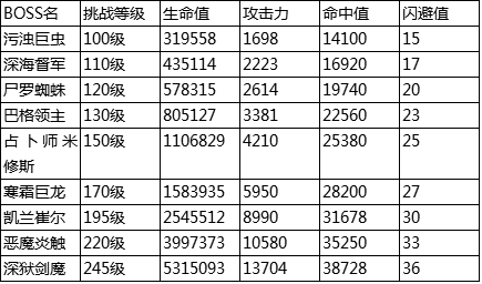 個(gè)人boss攻高血厚,挑戰(zhàn)他們需要足夠的勇氣和實(shí)力,這里有一份100至250級(jí)的BOSS信息表,希望可以給大家一個(gè)直觀(guān)的數(shù)據(jù)參考。
