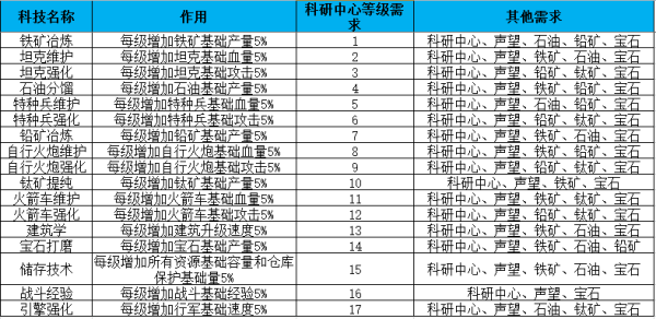 進(jìn)行科技研究的建筑,目前游戲中有17種科技,它們分別包括5種資源產(chǎn)量、8種兵種戰(zhàn)斗屬性、行軍速度、建筑建造時間、資源保護(hù)量以及戰(zhàn)斗經(jīng)驗加成。只需要使用5種資源即可將這些科技進(jìn)行升級??萍嫉牡燃壥芟抻诮巧穆曂燃?,而科研中心建筑的等級則影響科技研究的時間。