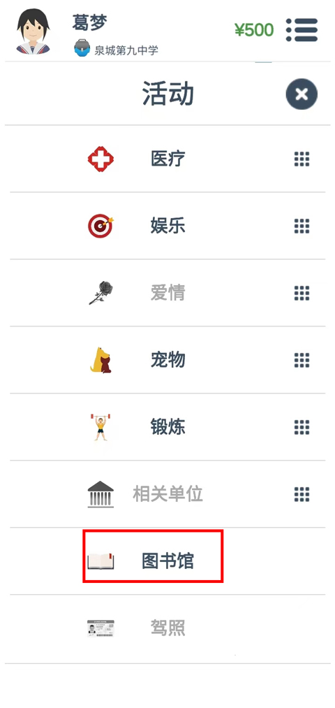 5、然后點(diǎn)擊右下角的【活動(dòng)】,再點(diǎn)擊【圖書館】,去圖書館可以提高智商哦~(由于年齡不夠,所以一些活動(dòng)就參加不了)