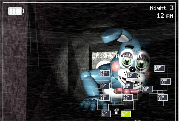 玩家亦需要定時觀察閉路電視11號和附帶的警告標記,控制獎品閣的音樂盒,以免傀儡出動。玩家還要適時穿上佛萊迪的面具,讓機器人偶經過警衛(wèi)室時不會將玩家視為可作攻擊的對象,但此舉會限制視線及其他裝置的操作,而且不是所有機器人偶都會被騙。