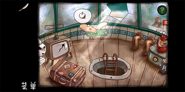 去右邊的場(chǎng)景把左下角的電路解開(kāi)。從這個(gè)場(chǎng)景得到水壺,拿著水壺去樓下的魚缸里打水,再回到這個(gè)場(chǎng)景給這個(gè)植物澆水,得到蘋果給小飛蟲(chóng)吃,得到鑰匙把機(jī)器人解鎖。