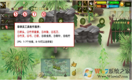 開局制作工具的先后順序:①斧頭、②竹竿套索、③木鋤、④石刀、⑤竹叉、⑥弓、⑦箭、⑧除蟲劑、⑨骨針、⑩炮竹