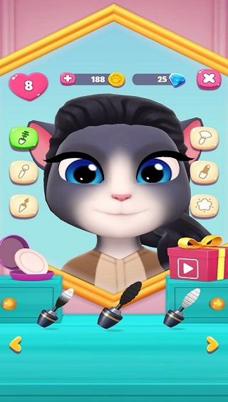安吉拉也是需要美美的!除了日常的梳毛外,我們可以在化妝間里面,幫助安吉拉涂口紅、涂眼影、畫眉毛,每個化妝品都有不同的顏色和樣式,我們可以打造安吉拉的獨(dú)特風(fēng)格。只有你想不到,沒有游戲做不到。我們在游戲中可以幫助安吉拉換膚色,換發(fā)型,或者換日常的服裝,衣服的款式非常多,總有一款你喜歡。