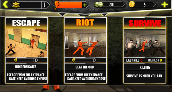 1、下載安裝好越獄模擬手機(jī)版,進(jìn)入游戲有三種模式可以選擇,逃脫、暴亂和生存。
