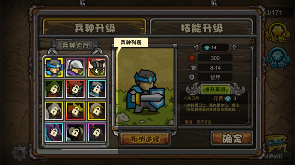 游戲的兵種和技能都在獵手大廳里,技能升級后在關(guān)卡中會可以使用強力技能,但需要用鉆石不得不說挺坑的;而兵種則升級效果一直在,為了能使用更多的兵種,前期大家快速通關(guān)關(guān)卡,往右邊路線通關(guān),可以把騎士和獵手先解鎖出來。