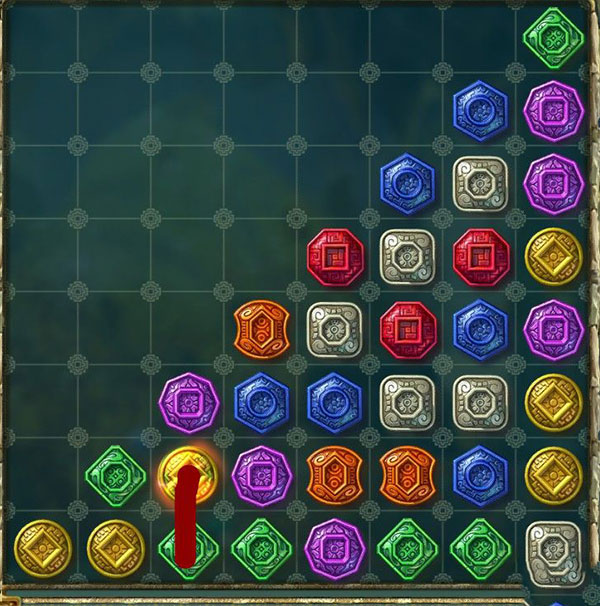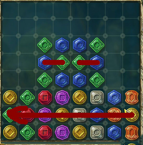 左半邊黃色寶石和最左邊的銀色寶石交換位置,形成三個(gè)連續(xù)的寶石就可以消除啦,右半邊跟左半邊一樣消除。