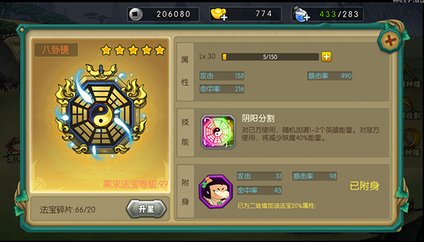 八卦鏡為二娃專屬法寶,可以提升自身屬性外還有特殊技能增加自身能量和降低敵方能量