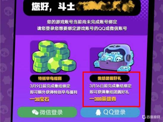 (1)荒野亂斗上線集結(jié)盛典活動(dòng)時(shí),現(xiàn)有賬號(hào)可與指定微信或QQ賬戶綁定,只要完成綁定流程,可以領(lǐng)取300英雄券的綁定獎(jiǎng)勵(lì)。