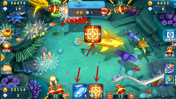捕魚不能一味攻打,關(guān)鍵時刻還要恰當(dāng)使用技能鍵。像白鯊或者金鯊,捕捉成功獲得的獎勵都比較大,即便你的炮倍數(shù)高,但是不運用一些輔助技能鍵,未必成功捕到大魚。使用瞄準(zhǔn)技能,配合高炮,就能助你提高命中率。使用冰凍鍵,能封動全場,這時你移動炮臺,找準(zhǔn)目標(biāo),就比較容易擊中。