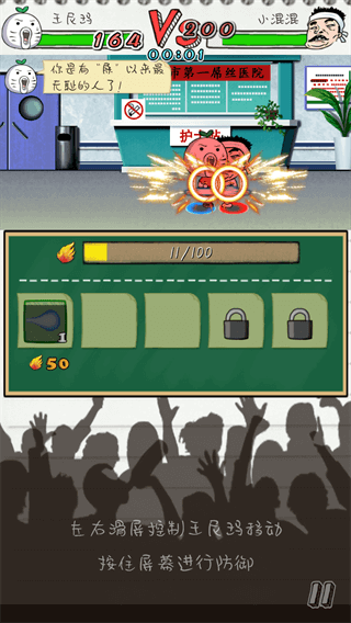 在里面技巧是左右滑動王尼瑪移動,按住屏幕是防御,下方是你的技能,技能越好敵人受傷就越大,特別注意點擊技能,一定要關鍵時刻來點擊。