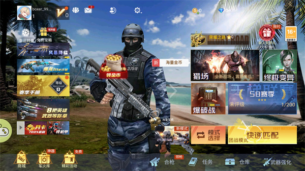 1、下載進(jìn)入生死狙擊之僵尸前線最新版游戲中,游戲有多種模式可以進(jìn)入,像獵場,終極變異等等,小編進(jìn)入的是“快速匹配”;