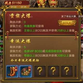 只需擊殺王級以上BOSS觸發(fā)大爆即可獲得,并且爆出的裝備都是25階以上的裝備(隨著等級的提高,后期游戲所接觸的BOSS級別和等級也會越高,有著貴族大爆次數(shù)的玩家,在完成任務(wù)或者刷BOSS的同時,也能體會到驚喜的感覺)有資源后持續(xù)更新完善!