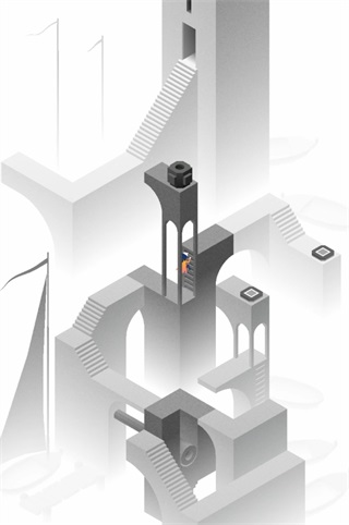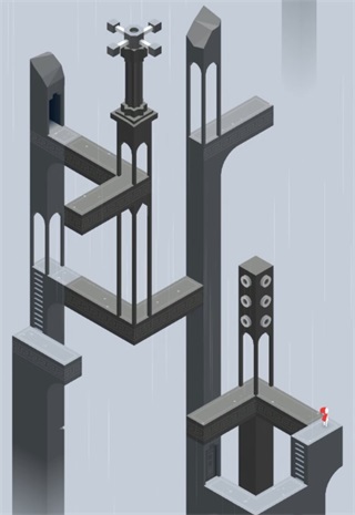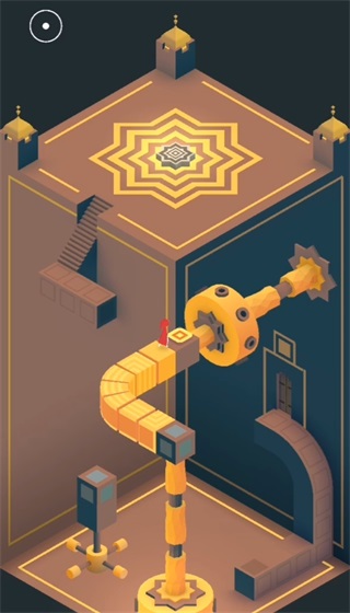 場景三先將建筑轉成下圖這個樣子,接著進入傳送門,小人會從中間一層的門出來,再次旋轉建筑,組成樓梯,使小人可以向上攀登,最后三次旋轉可以帶領小人進入最終的門啦!場景四中的凸弧形墻與凹弧形墻都是可移動的,先利用凸墻移動到前側灰色按鈕處,再到另一個按鈕處,圖騰出現(xiàn),本章完結。