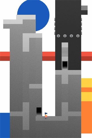 第十一章:來到第一個場景,玩家要先移動紅色建筑,讓其成為橋梁,操控小人通過,再次移動建筑,小人就能到達門處。第二個場景,第一步先上樓梯,轉動軸承,移動建筑,讓小人先上固定建筑,重復操作,點擊按鈕,場景變化,玩家又需要轉動軸承,讓小人能夠按另一個按鈕,然后玩家就可以從傳送門直接傳送至終點門所在地了。