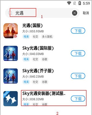 2、在上面搜索“光遇”,下面就會出現(xiàn)各種渠道服,用戶就可以下載測試服啦;