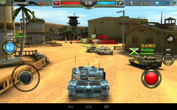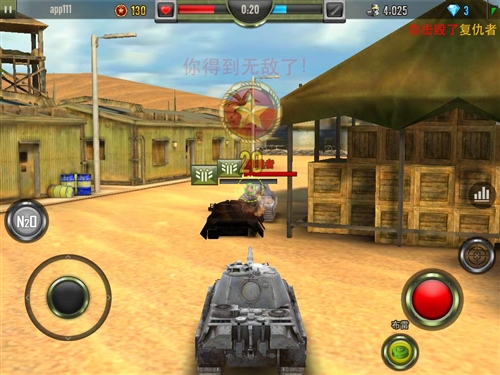 戰(zhàn)斗模式分單人亂戰(zhàn)或是組隊(duì)廝殺兩種,規(guī)則沒(méi)有復(fù)雜的條件限制,以最終所獵殺的坦克數(shù)量較多的一方或玩家為勝利者?;旧暇筒挥孟胩喾凑吹侥艽虻臄橙司徒o他毫不猶豫的轟下去就沒(méi)錯(cuò)!實(shí)際操作方面則是虛擬按鍵觸控,以左下角方向軸控制戰(zhàn)車(chē)的移動(dòng),右下角則是開(kāi)火鍵。每輛戰(zhàn)車(chē)的生命值一旦歸零就必須等待一定時(shí)間復(fù)活。