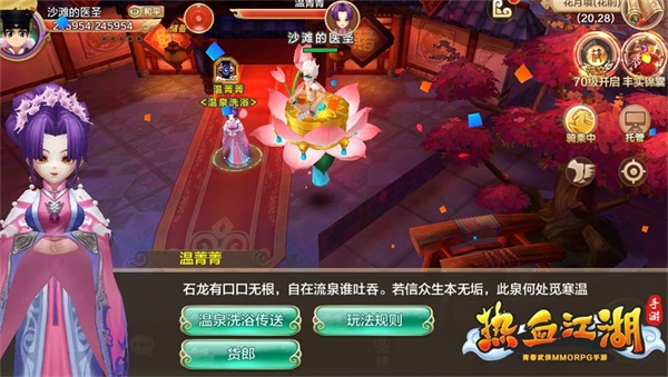 完成漂流瓶任務(wù)后,就可以去做一個(gè)更輕松的限時(shí)任務(wù)啦,它就是仙滿樓。仙滿樓每周可以進(jìn)入兩次,在花月鏡的溫菁菁進(jìn)入,來到溫泉浴場(chǎng)之后就能開始泡溫泉啦。非常方便的是這個(gè)任務(wù),不論是多人還是單人,都能進(jìn)行。單人可以獲得非常龐大的經(jīng)驗(yàn)值和歷練值,而多人還能多一些互動(dòng),通過飛吻、撿肥皂來促進(jìn)友誼,說不定還有意外的驚喜獎(jiǎng)勵(lì)喔~
