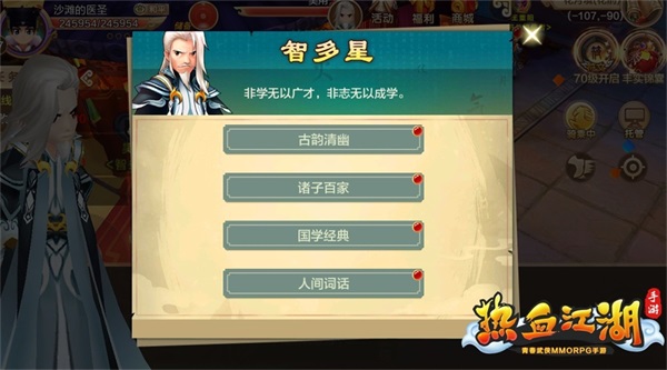 這里還有一個(gè)不得不提的休閑任務(wù),就是智多星。智多星和科舉不大一樣,智多星屬于平常的休閑任務(wù),隨時(shí)都能做。也是答題的形式進(jìn)行,不僅能拓寬自己的知識(shí)面,還能體會(huì)到古代的文雅詩(shī)詞等等。這個(gè)休閑任務(wù)不僅能獲得經(jīng)驗(yàn)獎(jiǎng)勵(lì),還有概率獲得紅利,在江湖中,紅利可是非常珍貴的喲。