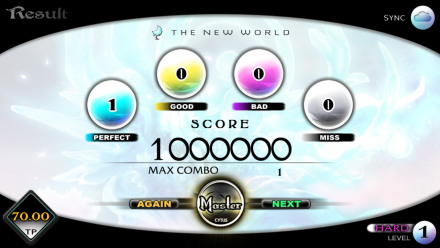 當(dāng)完成一首曲目的游玩時(shí),便會(huì)出現(xiàn)結(jié)算畫(huà)面。游戲結(jié)算分為五種,分別為總分(Score)、技術(shù)反饋、評(píng)價(jià)(Grade)、技術(shù)得分(TP)和最大連擊數(shù)(Max Combo)