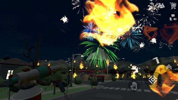 4、進(jìn)入地圖,現(xiàn)在正式開始教大家怎么操作煙花模擬器,屏幕左邊是移動,右邊的按鈕可以撿起煙花、擺放煙花、拿出點火器點火、跳躍,然后就是右上角的煙花商店按鈕