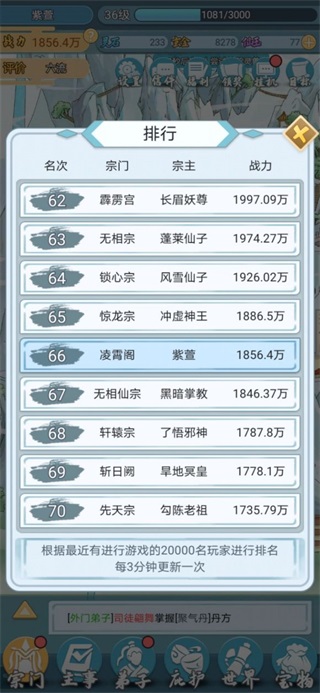 大比最主要的功能就是空出雜役弟子的位置和增加修為增長速度。只有空出雜役弟子的位置,才能不斷招人,所以要每次大比都有前三才能保證宗門戰(zhàn)力的高速增長。小技巧,前期強化寶物給弟子裝備增長戰(zhàn)力贏得前三,再全部卸下以此循環(huán)。不要看大比的打斗介紹花里胡哨,只要弟子戰(zhàn)力達標就可以進前三,雜役弟子戰(zhàn)力在2.5W左右就可前三,穩(wěn)一點4W以上就可以第一(有時候也看運氣,我有一次4.2W就落選了,一次3W第一),外門6.5W左右前三(7.5W以上第一),內(nèi)門弟子11W前三(12W第一)。內(nèi)門弟子前三可以升核心弟子或親傳弟子,怎么升親傳好像是隨機吧,沒測出來。大比盡量得第一,后面的大比,第一和第三的修為增長速度獎勵差距越大。后期雜役大比包前三,盡量多加人進宗門。