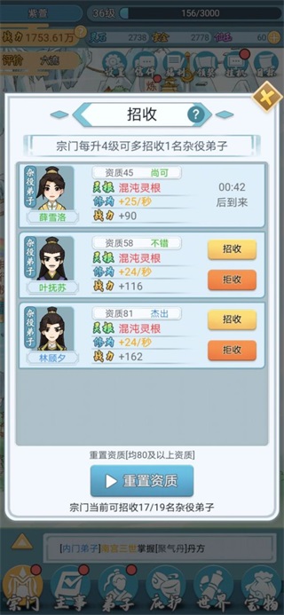 招人:弟子面板分四個:資質(zhì),靈根,修為,戰(zhàn)力。招人首先看靈根,其次看資質(zhì),修為的增長有3方面相加:資質(zhì),靈根,修為。