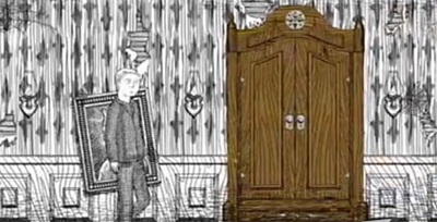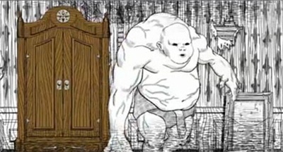 進(jìn)入地下室,穿過很多洋娃娃的房間,一幅特殊的紅色邊框女性畫, 向前,終于遇到大麻煩,一個巨大的怪物出現(xiàn),躲進(jìn)衣柜。