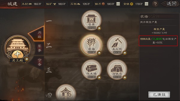 2)農(nóng)場(chǎng):提高糧食產(chǎn)量(與領(lǐng)地資源無(wú)關(guān),自己城里產(chǎn)的),點(diǎn)到20級(jí)屯田獲得量增加50%