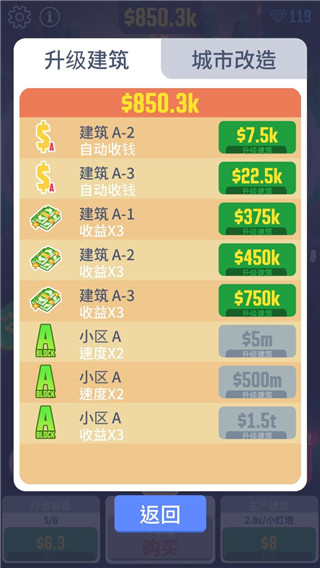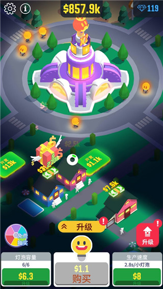 升級(jí)燈泡國(guó)王,獲得更多的能量解鎖建筑和街區(qū)。