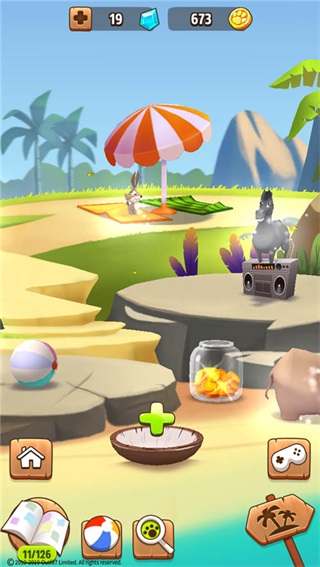 海灘有很多的小地圖,一開始只解鎖一個(gè),后面隨著我們的等級(jí)提升,解鎖的小地圖也會(huì)越來(lái)越多,不同的小地圖里可以放不同的玩具,吸引不同的動(dòng)物。