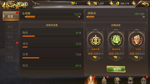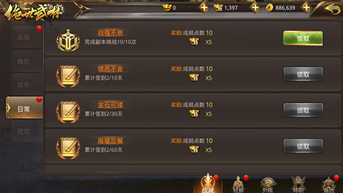《絕世武林》的成就系統(tǒng)就在角色系統(tǒng)中,目前共有73個(gè)成就,大致分為角色、成長(zhǎng)、日常、社交四大類(lèi)。每當(dāng)玩家達(dá)成任意一個(gè)成就后,都會(huì)獲得數(shù)量不等的綁定元寶。但需要注意的是,這里的獎(jiǎng)勵(lì)需要玩家手動(dòng)領(lǐng)取,而非系統(tǒng)自動(dòng)發(fā)放。