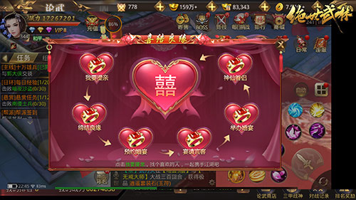 完成以上六步后,玩家和愛(ài)人就可能結(jié)成神仙眷侶,從此攜手江湖。為了讓結(jié)婚更加便捷,玩家不妨提前準(zhǔn)備好婚戒。婚戒不僅是雙方愛(ài)情的象征,同時(shí)還能為大家?guī)?lái)屬性加成,讓你們能共同提升各項(xiàng)屬性。
