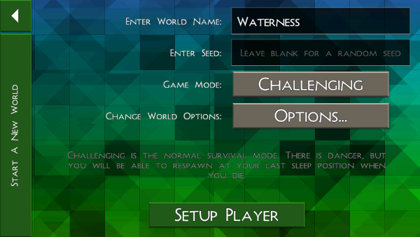 4、點(diǎn)擊“new world”后,我們需要對(duì)創(chuàng)建世界,進(jìn)行自定義的設(shè)置,設(shè)置完成后點(diǎn)擊“setup player”;