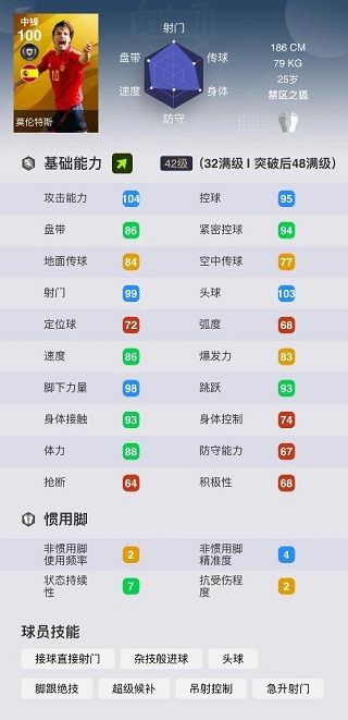 在替補上場后,莫倫特斯的速度來到了喜人的90,身體接觸也會變成深綠,沒有一個后衛(wèi)會喜歡和這樣一個大模型的中鋒來一次貼貼。非慣用腳精度4讓他可以左右開弓,接球直接射門、急升射門、雜技般進球和吊射,四個射門技能讓他在剩余的時間里,要做的就是抓住機會起腳。