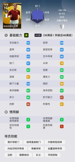 很多人可能要問了,托蒂在斜向上的時候數(shù)據(jù)已經(jīng)溢出辣么多了,如果還替補上場的話豈不是有很多數(shù)據(jù)都浪費了?雖然托蒂擁有爆表的盤控,但是沒有一個盤帶技能為托蒂加持,在實際使用中,無論是托蒂的速度還是實際表現(xiàn)都不足以讓他做出盤帶過人的舉動。