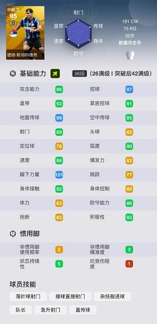 99的地面?zhèn)髑虮U狭怂鳛閎2b不會失業(yè),而89的射門和101的腳下力量讓我們想起了那個以遠(yuǎn)射著稱的鐵人內(nèi)德維德,可以說斯坦科維奇91的總評絕對是被嚴(yán)重低估的金球中場之一。