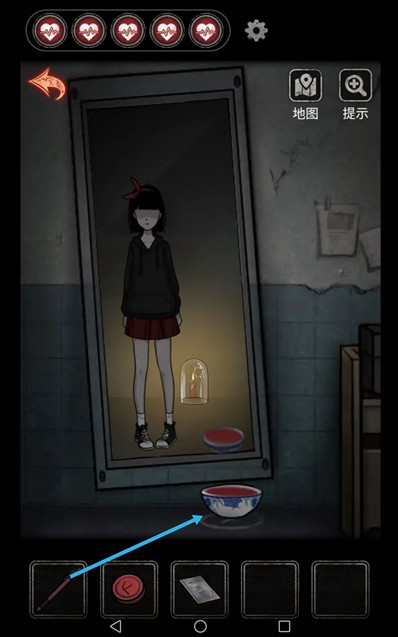打火機點燃鏡子前的蠟燭,罩子用上。碗放鏡子前地上,倒墨水,用筆敲。