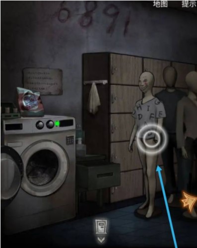 離開浴室,地上有一根繩子,墻上寫著密碼,1689打開洗衣機,排水獲得模特的假手和衣服