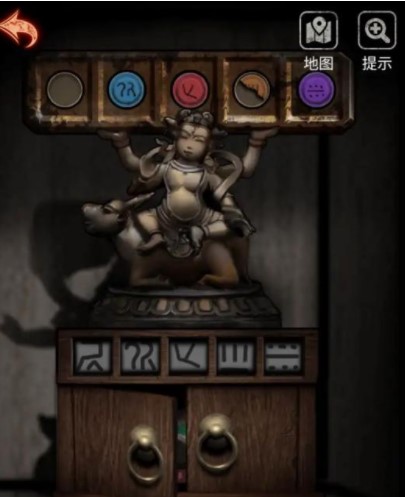 切換場景,大柜子按鍵順序:21435。得到太陽飾品,左上角的書內(nèi)容是提示。