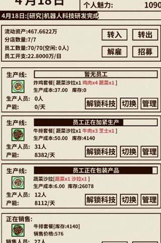 5.機(jī)器人科技。前期資金緊缺,在機(jī)器人大賽前點(diǎn)上一次就行,后邊必須一直跟著點(diǎn),贏了可以增加銷量(注意分配生產(chǎn)人員和銷售人員,一般產(chǎn)量要稍大于銷量,這樣機(jī)器人大賽后正好可以追回來,不用來回調(diào)整)一句話,怎么偷懶怎么來。