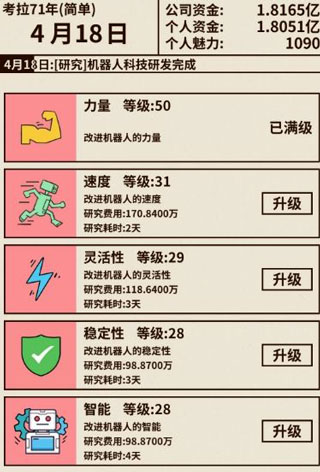 首先說一下游戲獲勝的辦法。要想治好“爸爸”,必須得把機(jī)器人科技都升滿,一共是五項(xiàng),一個項(xiàng)目升級分別需要2、2、3、3、4天,滿級都是50級。嗯。一共是700天,也就是說最快也要700天才能游戲勝利。整個游戲最吸引人的肯定是前邊創(chuàng)業(yè)的部分,步入正軌之后就沒得意思,只為了刷成就了。所以在創(chuàng)業(yè)的時(shí)候分享一下我的看法。1.員工。最好在前兩天就把員工招滿,利潤翻倍。