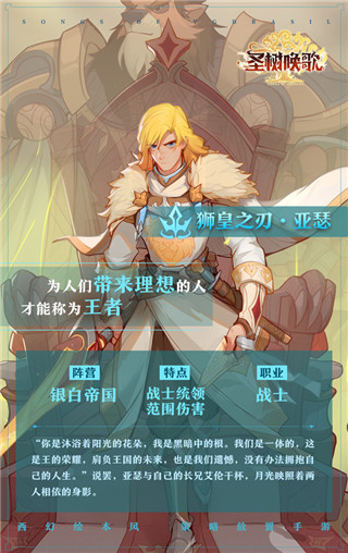 艾倫總是喜歡問亞瑟,“如果我們不必繼承王國(guó),你最想做什么事情?”亞瑟的回答永遠(yuǎn)是:“無拘無束地去看遍這個(gè)世界。”每次說罷,兩兄弟的嘴角總會(huì)浮現(xiàn)苦澀的笑容,皇儲(chǔ)的身份就像一把閃爍著榮耀光芒的枷鎖,將他們的命運(yùn)緊緊銬勞。\n##在第二次中土大戰(zhàn)中,因?yàn)榘8駹柌舻谋撑眩蹏?guó)的軍隊(duì)被擊潰,艾倫和亞瑟逃亡到自然之森中。也不知道在森林中迷失了多久,傷痕累累,饑寒交迫的兩人看到了一片閃閃發(fā)光的湖泊,仿佛是傳說中的圣湖。