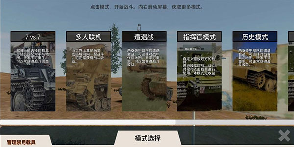 歷史模式:倆支裝甲部隊的遭遇會戰(zhàn)??蛇x擇對戰(zhàn)的載具與地圖,玩家不可重生
