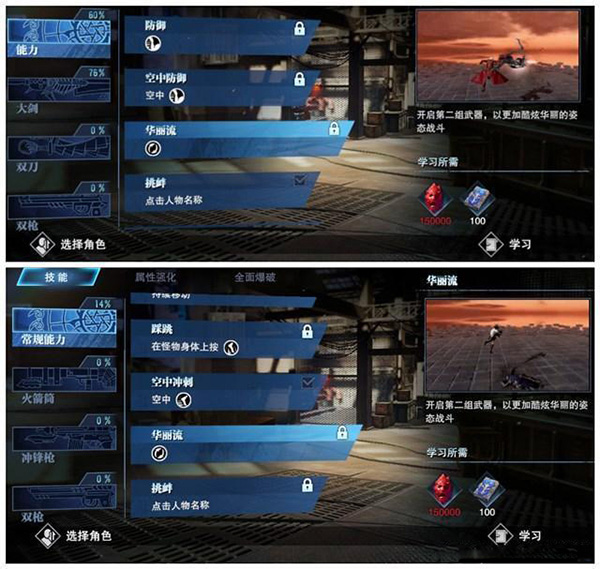 在能力技能中有一個(gè)華麗流能力技能,解鎖華麗流技能在戰(zhàn)斗中可佩帶兩把主武器(包括華麗流兩個(gè)角色都是不通用的),切換使用可在戰(zhàn)斗中有更多的華麗連招。
