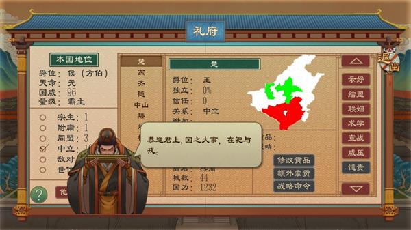 制定對列國的外交政策,可通過示好、結(jié)盟、聯(lián)姻拉攏列國,也可以通過宣戰(zhàn)、威壓、索貢、譴責(zé)壓制他國。