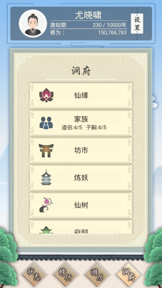 洞府承載著仙緣、家族、訪市、煉妖、仙樹(shù)和府邸等玩法,其中家族和仙樹(shù)以及府邸對(duì)修為的成長(zhǎng)很有幫助。