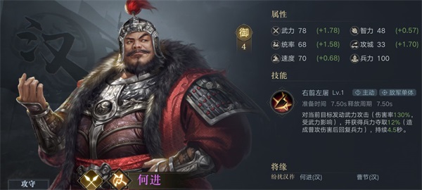 紫將何進:御值3御,發(fā)動一次武力攻擊,并獲得4.5秒的兵力奪取,間隔7.5秒。